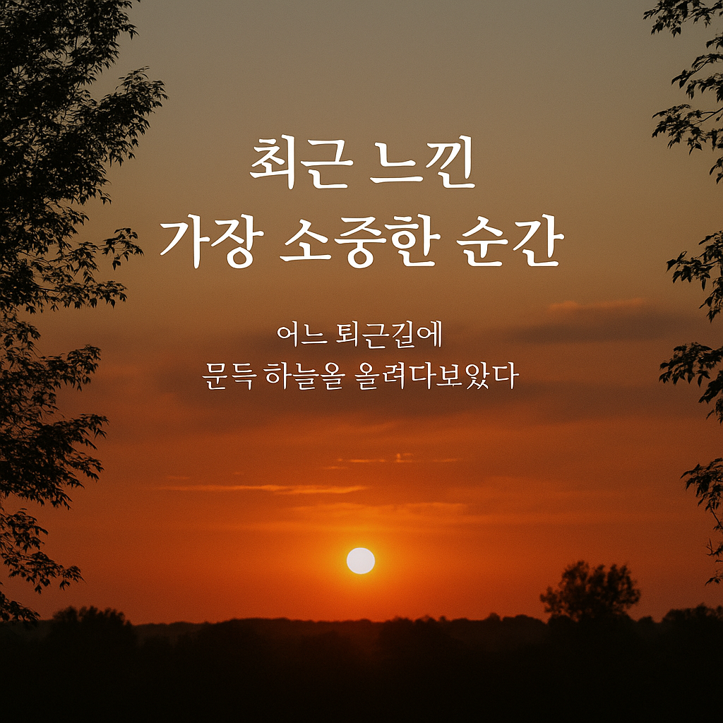 바쁘게 돌아가는 일상 속에서, 어느 순간 멈춰 서서 “지금 이 순간이 참 소중하다”고 느끼는 경험은 그리 자주 오지 않는다. 그런데 며칠 전, 퇴근길에 문득 그런 순간을 맞이했다. 하루 종일 정신없이 일하고 지친 몸을 이끌고 집으로 향하던 길, 평소라면 휴대폰을 보거나 음악을 들으며 무심히 걸었겠지만 그날은 그냥 하늘을 올려다보았다. 노을이 지고 있었다. 오렌지빛 하늘 아래로 구름이 천천히 흘러가고, 바람은 선선했다. 이어폰도 빼고, 휴대폰도 주머니에 넣고, 나는 그 자리에 멈춰 서서 하늘을 바라봤다. 마음이 참 이상하게 잔잔해졌다. 무언가 거창한 일이 있었던 건 아니었다. 단지, 그 순간만큼은 아무런 생각도 들지 않고 그냥 ‘지금’이 너무 좋았다. 오랜만에 온몸으로 살아있음을 느끼는 느낌이었다. 그날 ..